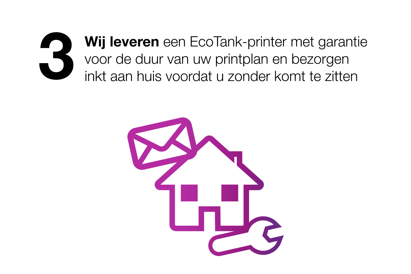 3 ReadyPrint EcoTank is beschikbaar voor de volgende modellen: ET-2870U, ET-2850U, ET-4850U, ET-5850U, ET-16650U en ET-M1170U . Er wordt een EcoTank-printer geleverd voor gebruik gedurende de looptijd van het printplan. Als u meer pagina’s print dan uw abonnement toelaat, worden er extra kosten in rekening gebracht.